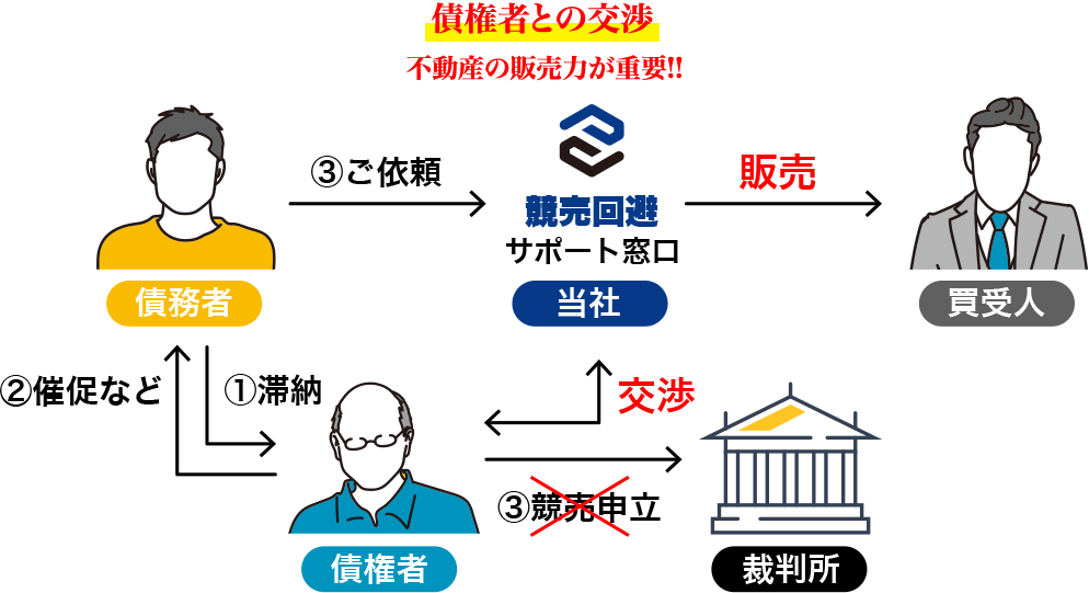 また、「競売回避サポート窓口」では、債権回収会社出身のスタッフと住宅仲介キャリア30年以上のベテランがそのような事態解決のお手伝いをします。単に任意売却のお手伝いをするだけではなく、残りの債務に関しても、必要に応じて弁護士とも連携して債権者と交渉をさせていただき、負担が軽減されるようにお手伝いさせていただきます。